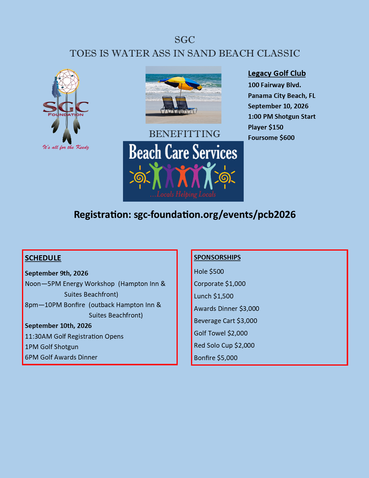 SGC Panama City – Toes in the Water A** in Sand Tournament will include goodie bag, golf, prizes and awards luncheon for $150. There will be prizes for first, second, and third as well as closest to the hole and long drive. There will be specialty contest holes like marshmallow drive, skills short game holes and more.