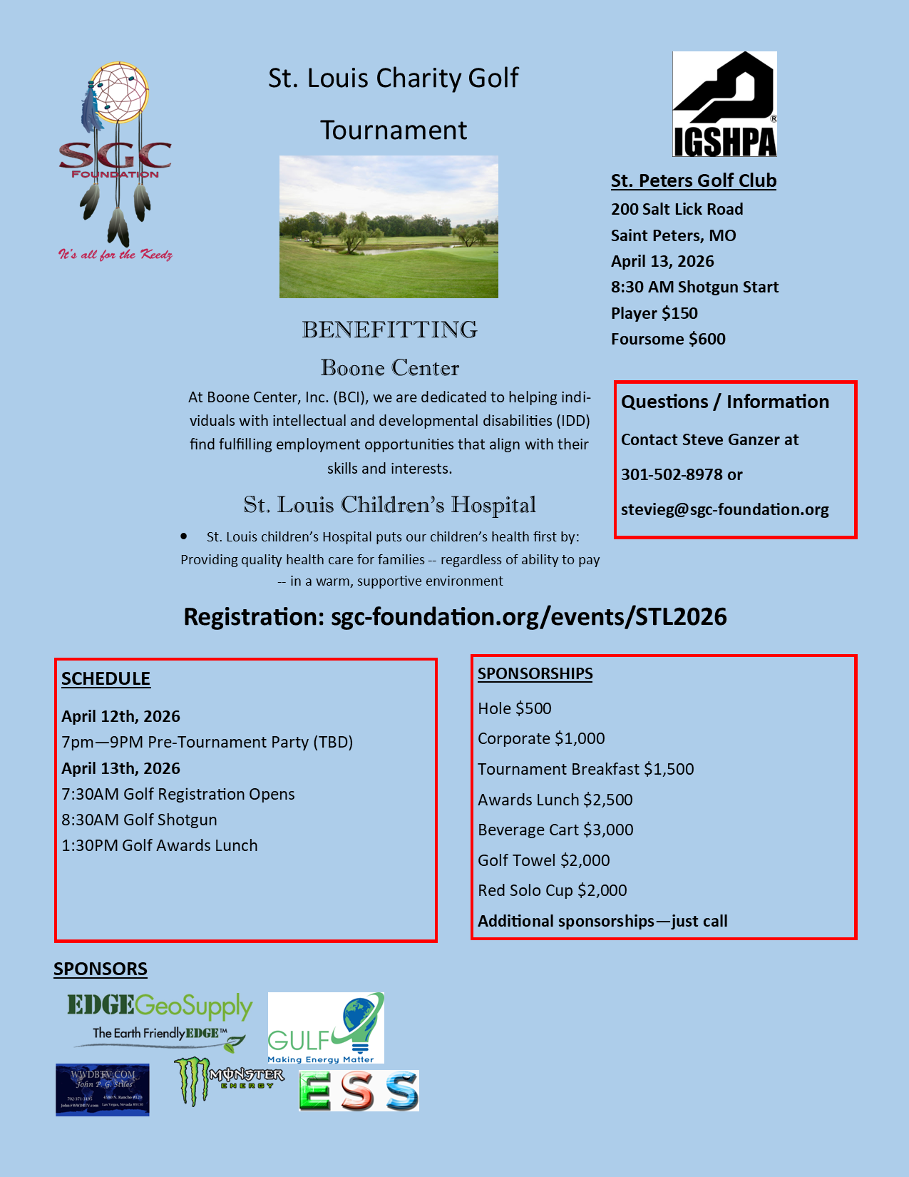 SGC St. Louis Charity Golf Tournament will include goodie bag, golf, prizes and awards luncheon for $150. There will be prizes for first, second, and third as well as closest to the hole and long drive. There will be specialty contest holes like marshmallow drive, skills short game holes and more.